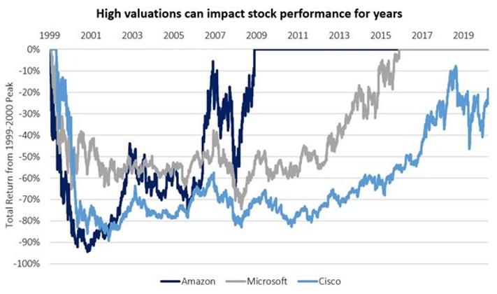 Even though all three have maintained dominant positions in their industries, looking at the total returns from their respective share price peaks at the turn of the century show how long it can take to recover after FOMO has taken hold. It took Amazon nearly 10 years to recover losses, Microsoft 15 years and Cisco is still not there, more than 20 years later.