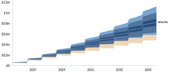 Let’s first look at how £58,000 a year would accrue if invested in a Netwealth Risk Level 7 portfolio through a general investment account and subject to a higher-rate tax. This would build up to £702,757 after 10 years in the average scenario.