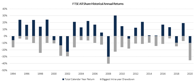 It’s useful to be aware of how volatile markets can be. Even in years when they go up, they can experience profound losses during that 12-month period. The chart below, for example, shows how even in particularly strong years there have usually been falls, too – and conversely, even when there are falls, markets tend to rise more often than decline by the end of the year.