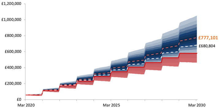 Conversely, if £58,000 a year is subscribed to ISAs for a family group each year, the sum invested could attain £777,101 after 10 years, in an average scenario. In only 10 years, utilising the ISA allowances would result in an increase of nearly £100,000 in the end portfolio values, as shown below: