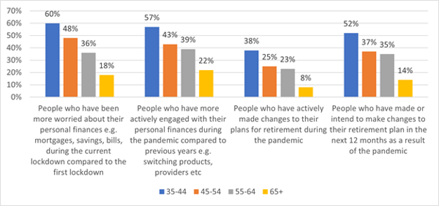 - Concerned about the long-term implications of the crisis, more than a quarter (28%) of adults aged 35-64 have already made changes to their retirement plan, increasing to 38% for those aged 35-44.